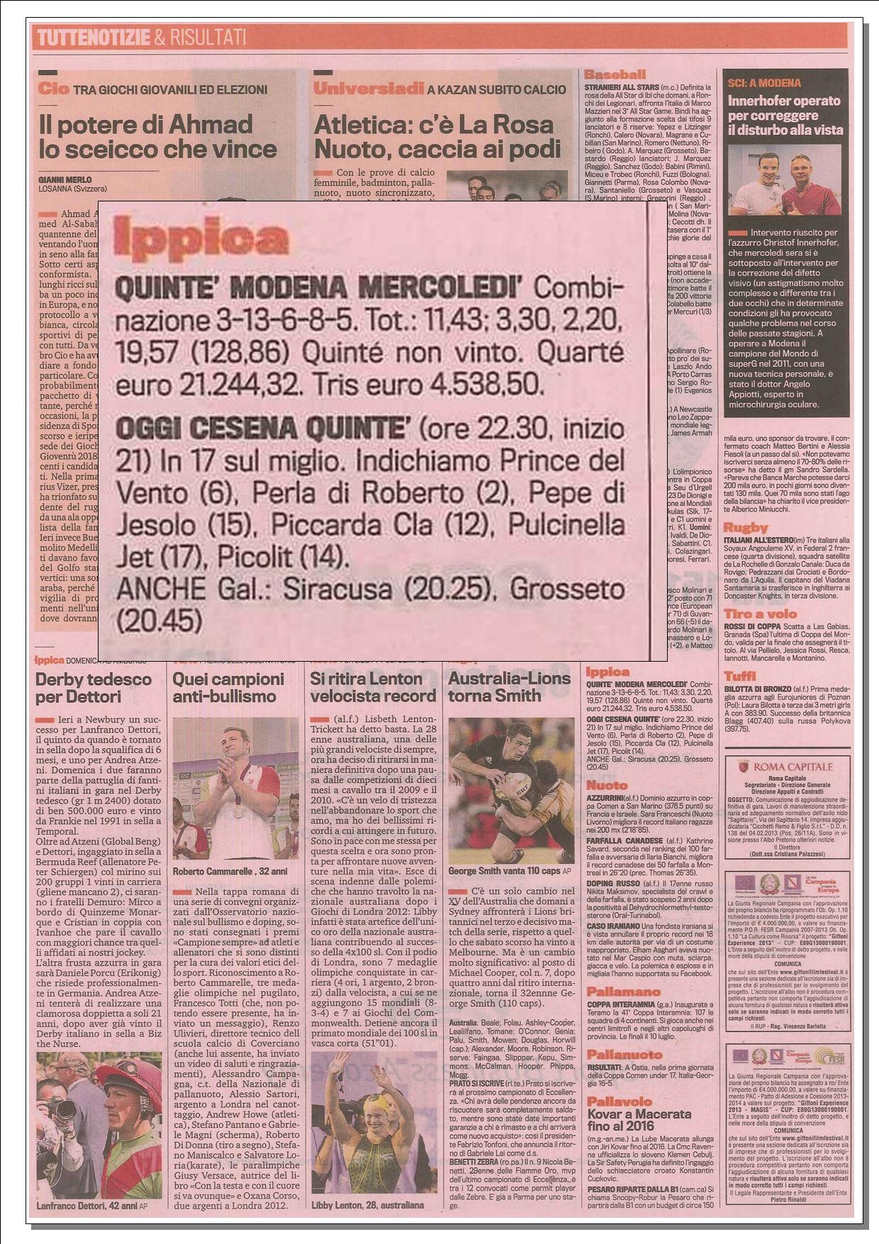 Venerdė 5 luglio - Premio ME.GA. FOODS - TRIS: Articolo del 05/07/2013 - Pagina n° 27